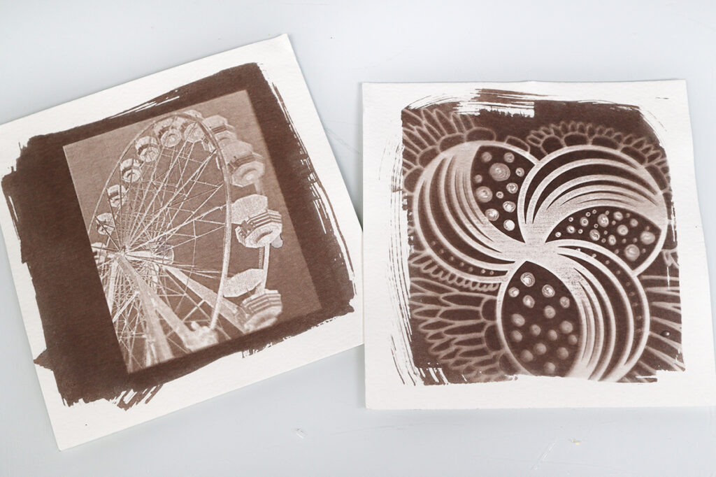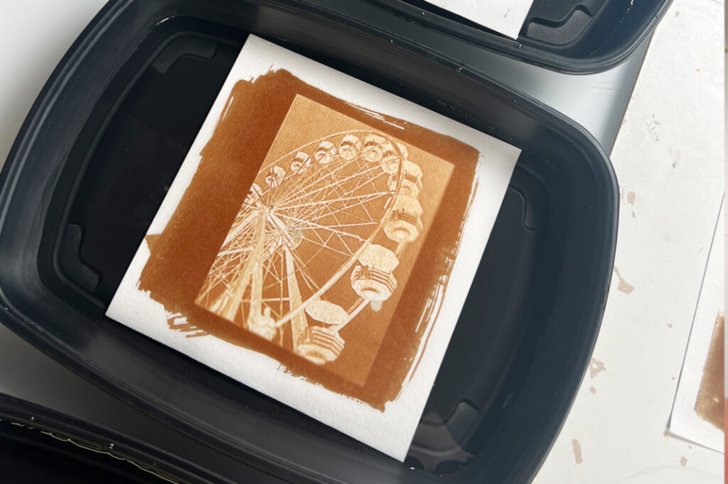 Vinkki! Jos tekniikka on sinulle täysin uusi, suosittelemme aloittamaan kokeilemalla ensin syanotypiaa, ja siirtymään vasta sen jälkeen testaamaan Van Dyke -menetelmää. Lue syanotypiasta lisää artikkelissa Syanotypia – Aloittelijan opas. Van Dyke -prosessi on herkempi ja siinä käytettävät kemikaalit vaarallisempia. Sitä voisikin kutsua syanotypian “isoveljeksi”. Van Dyke -menetelmän herkkyys mahdollistaa paljon yksityiskohtaisempien tuotoksien luomisen – erityisesti tulostettujen valokuvien kohdalla.