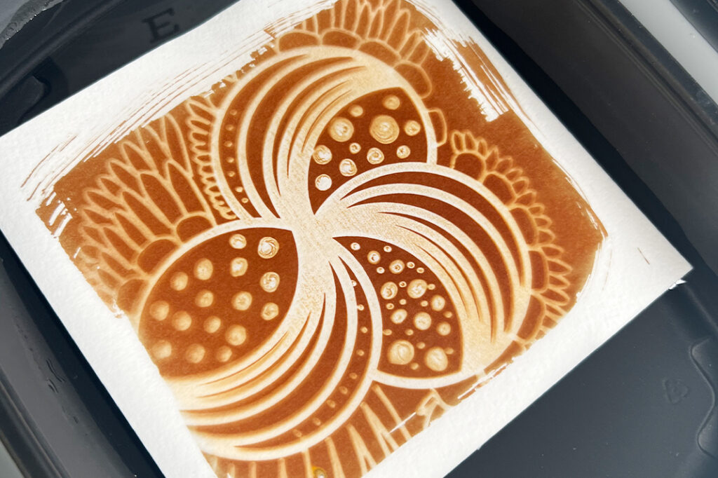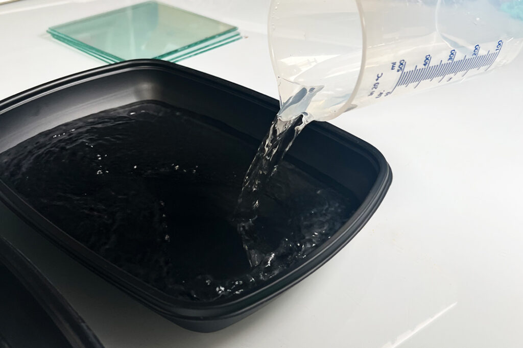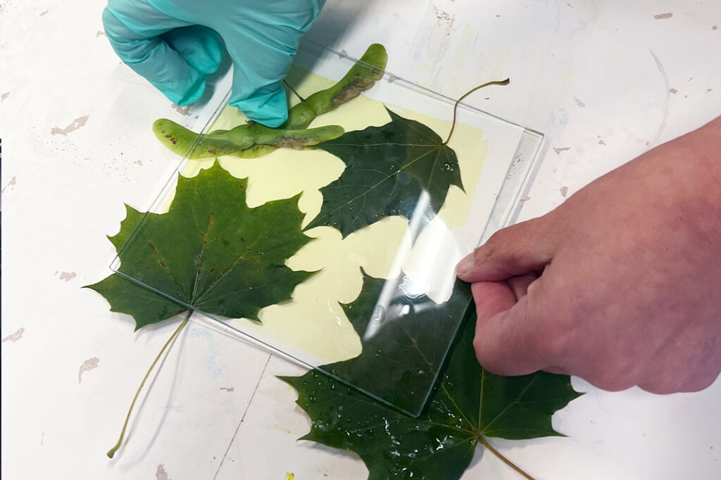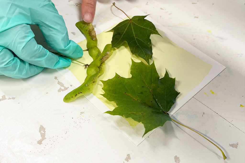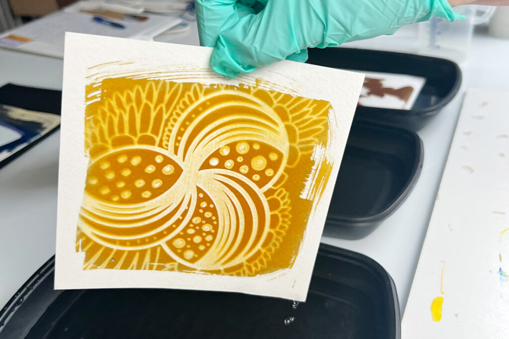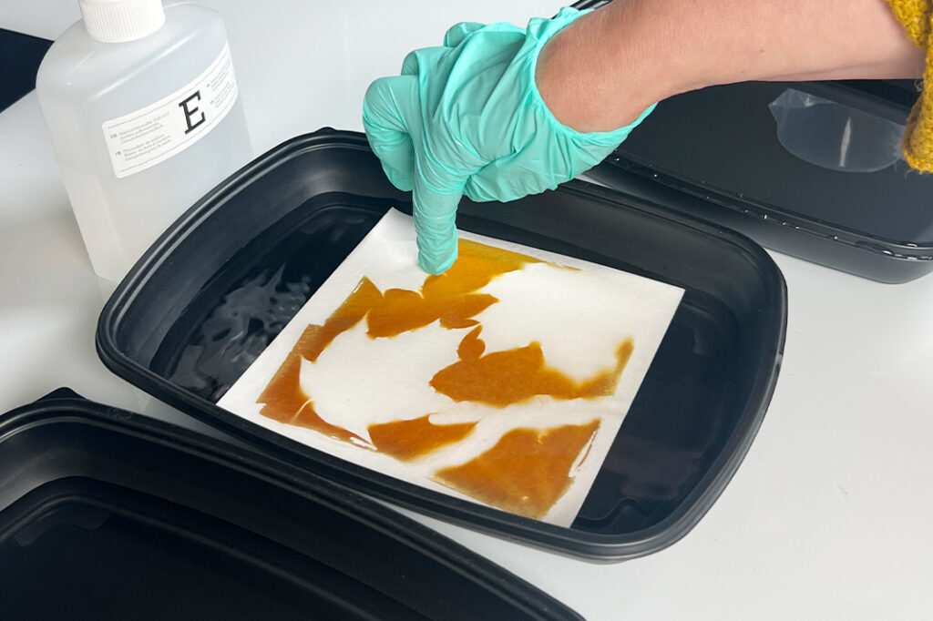 Levitä sitten liuos mahdollisimman tasaisesti akvarellipaperille esimerkiksi vaahtomuovisiveltimen avulla. Muista käyttää kertakäyttöhanskoja! Varo ottamasta liikaa ainetta siveltimeen – vähemmän on enemmän. Varmista, ettei paperille jää paksumpia ”lätäköitä” – ne eivät kuivu kunnolla ja vaikuttavat lopputulokseen.