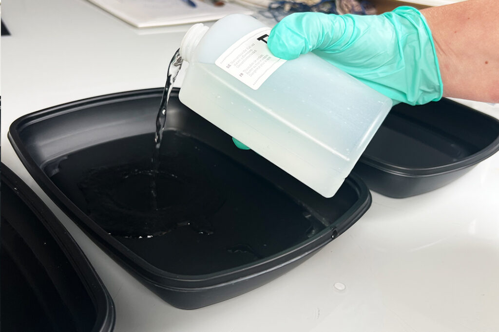 Nosta paperi jälleen kaukalosta, ravistele ylimääräinen liuotin pois hellästi mutta huolellisesti ja siirrä paperi vielä 10 minuutin ajaksi toiseen, vedellä täytettyyn kaukaloon.