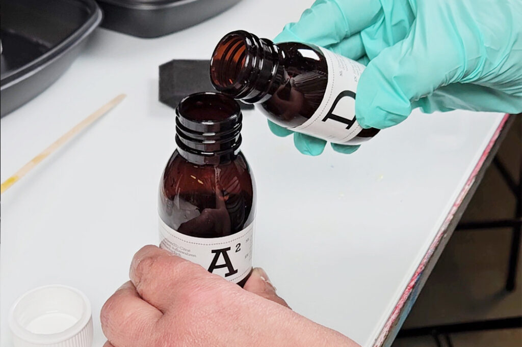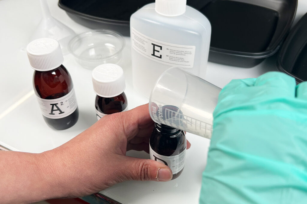 Huomaa! Kun olet sekoittanut pullojen aineet keskenään lopulliseksi seokseksi, tulee se käyttää saman päivän aikana. Seosta kannattaakin tehdä vain vähän kerrallaan. Samoin seoksella aktivoitu paperi tulee käyttää saman päivän aikana.