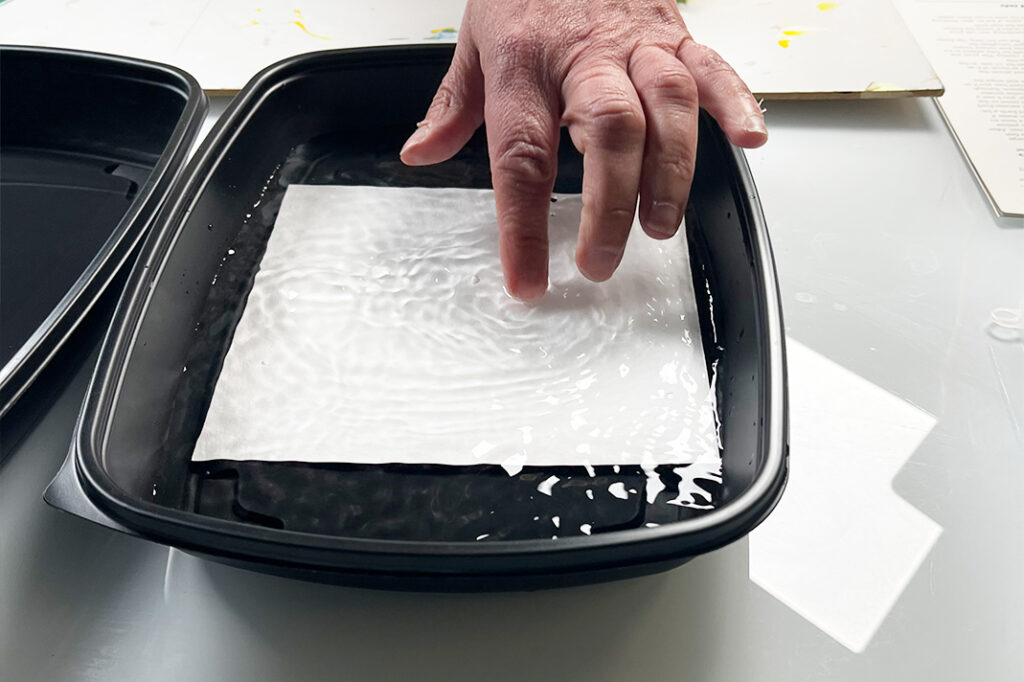 Siirry vesipisteelle, jonne olet asettanut huuhtelukaukalot. Irrota akvarellipaperin päältä lasilevy/pleksi sekä kalvo, esineet tai kasvit. Siirrä paperi sitten nopeasti ensimmäiseen, vedellä täytettyyn huuhteluastiaan kuvapuoli alaspäin. Liota vedessä 10 minuutin ajan. Vaihda vesi tarvittaessa kertaalleen.