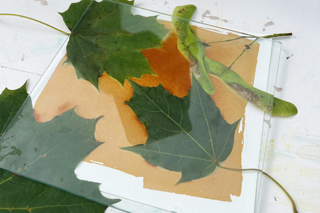 Siirrä paperi sitten alustan kanssa ulos suoraan auringonvaloon. Pidä akvarellipaperia auringonvalossa noin 2 minuutin ajan. Voit hiukan pidentää tai lyhentää aikaa auringonvalon voimakkuudesta riippuen.