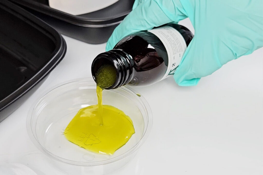 Kaada valmista seosta maltillisesti pyöreään muoviastiaan (seos on riittoisaa, et siis tarvitse kerrallaan kovin paljoa). Muista ravistaa pulloa uudelleen, jos kaadat seosta astiaan myöhemmin lisää. Myös muoviastiassa pidempään seissyttä seosta kannattaa ajoittain sekoittaa pakkauksen mukana tulleella sekoitustikulla.