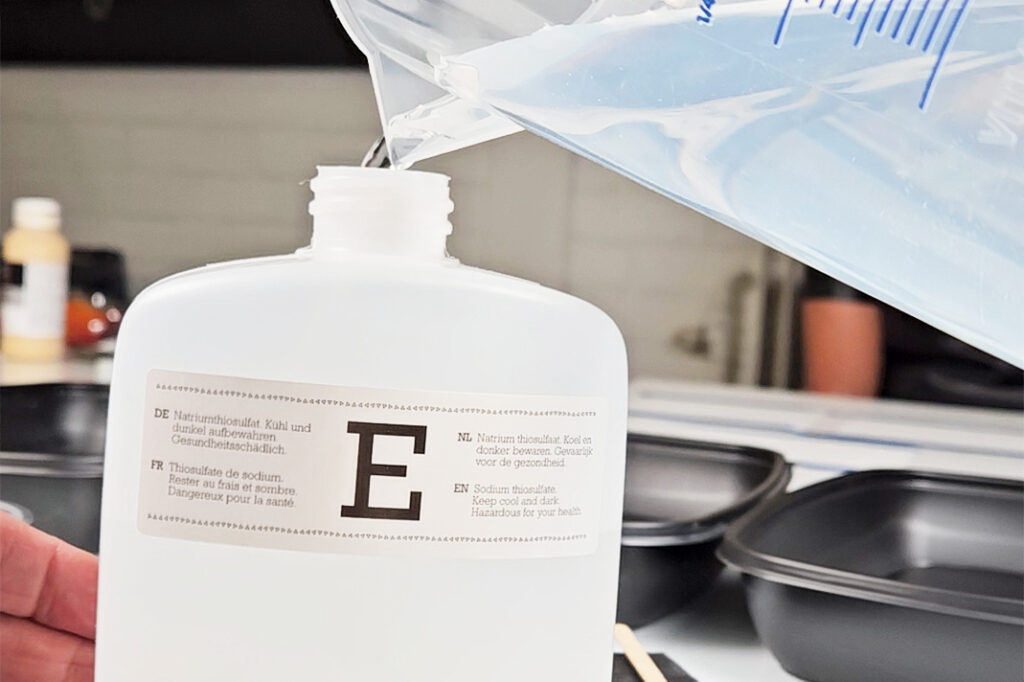 Lisää sitten kolmanteen huuhtelukaukaloon liuosta E-merkitystä pullosta (lisää tähän siis pelkkää liuosta, älä vettä).