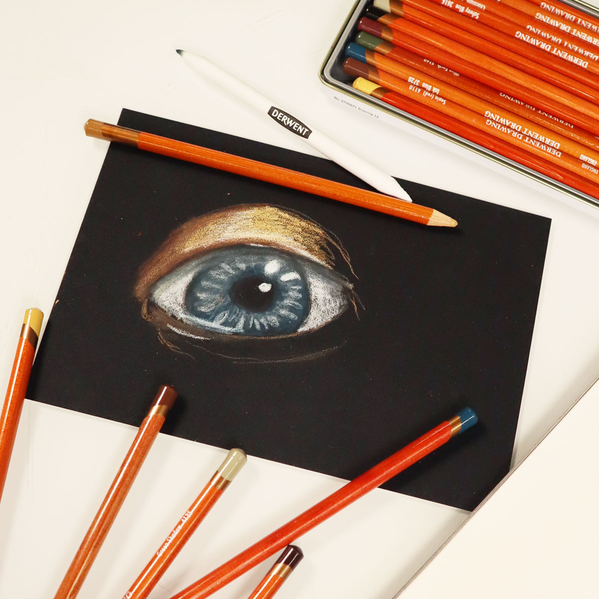 Jos haluat lisätä teokseesi tarkempia yksityiskohtia tai kirkkaampia värejä, voit käyttää esimerkiksi Derwentin Coloursoft-värikyniä yhdessä Drawing-kynien kanssa. Värien hallittuun sekoittamiseen suosittelemme saman valmistajan häivytinlajitelmaa. Voit myös hyödyntää pyyhekumia kevyiden kerrosten kumittamiseen sekä korostusten tekemiseen – kokeile esimerkiksi pehmeää Ultra CLN -pyyhekumia.