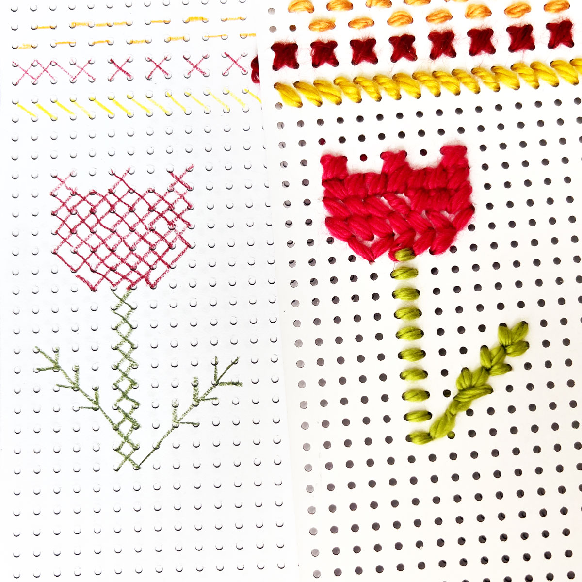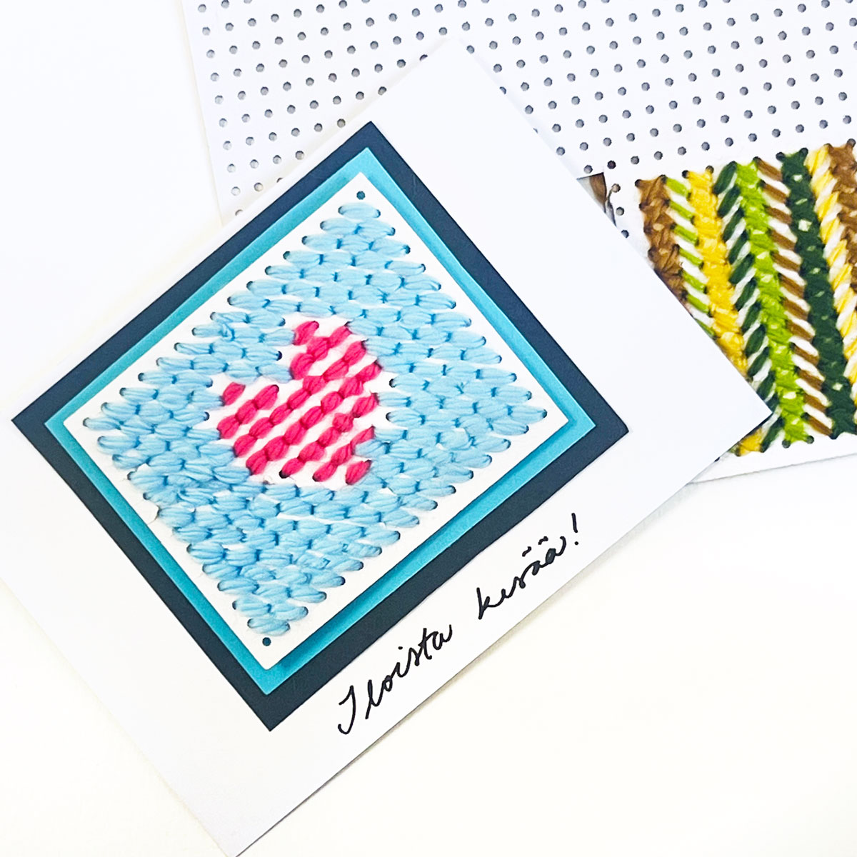 Kirjontapohjat on valmistettu vahvasta kartongista, jonka voit halutessasi myös leikata osiin. Näin saat vaikkapa uniikit kortit tai somat lahjalaput! Kuvalliset, englanninkieliset ohjeet mukana.