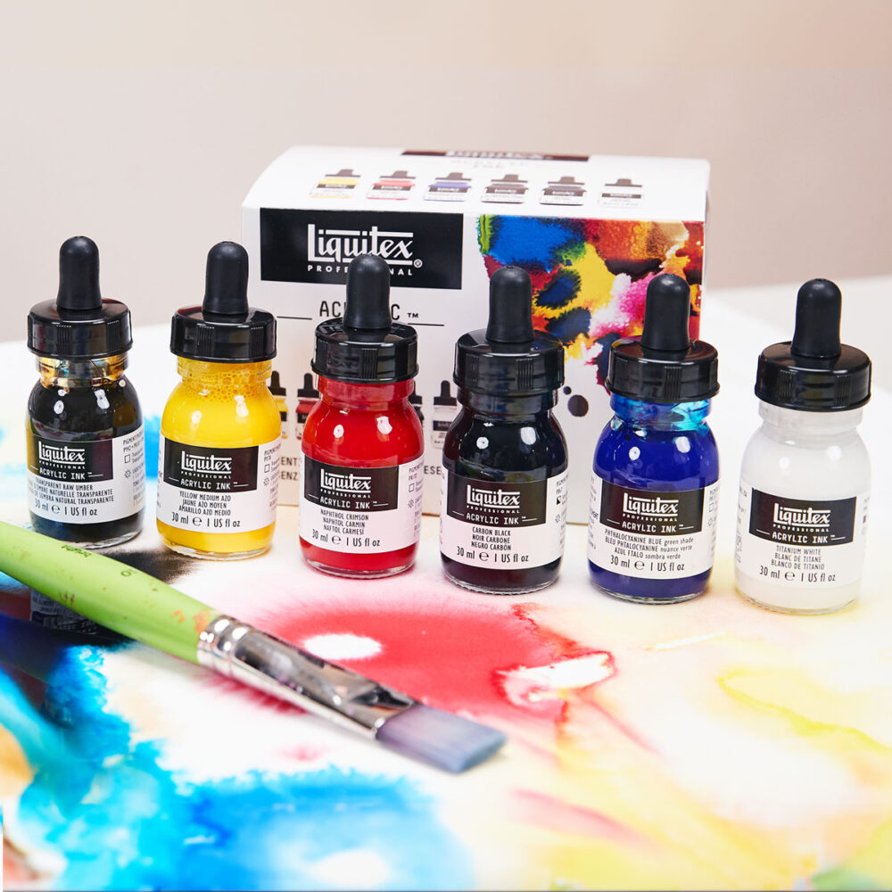 Liquitex Acrylic ink -akryylimusteet ovat taiteilijalaatuisia musteita, joilla on korkea valonkesto ja upean intensiiviset värit. Ne ovat käytännössä erittäin nestemäisiä akryylivärejä, jotka kuivuvat tavallisten akryylivärien lailla nopeasti vedenkestäviksi, eivätkä leviä tai hälvene kastuessaan uudelleen. Värien kerrostaminen sujuu siis helposti ja ilman sotkua!