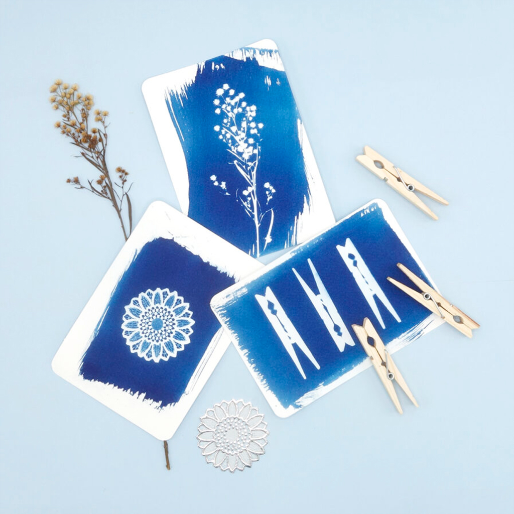 Syanotypiaa voidaan tehdä pakkauksen mukana tuleville postikorteille kolmella tavalla: