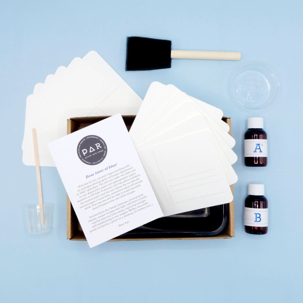 Par Cyanotype Kit Postacard on Tee se itse -syanotypiasetti, jota voit käyttää herkkien, sinivalkoisten printtien tekemiseen kotona ilman pimiötä!
